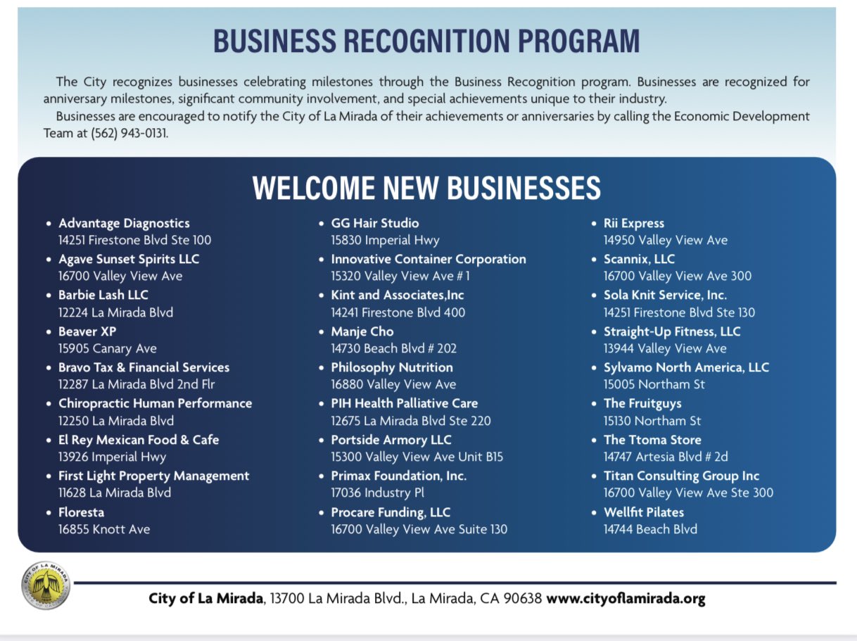 La Mirada Councilmember John Lewis On Twitter Many Thanks To The New Businesses That Decided To Open Up In La Mirada Recently Sign Up For Business Watch And The Business Recognition Program